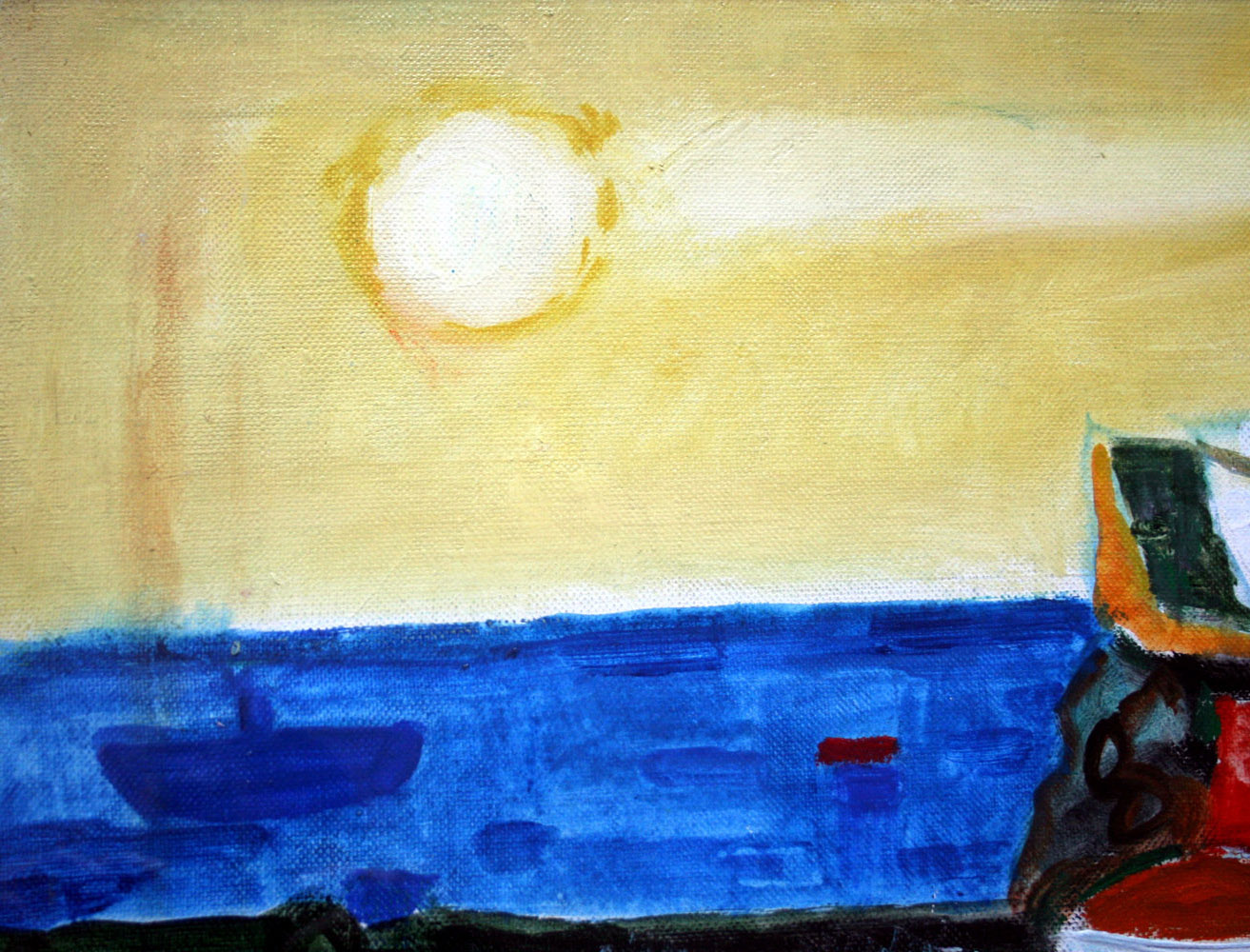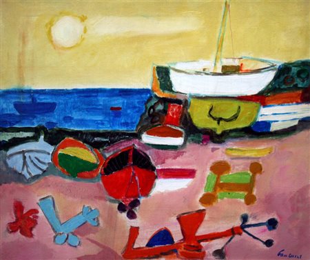 Enrico Paulucci 1901, Genova (Ge) - 1999, Torino (To) - [Italia] Barca bianca olio su tela 50x60 cm 1972 firma dell’artista in basso a destra e sul retro; opera con cornice certificato di autenticità firmato dall'artista