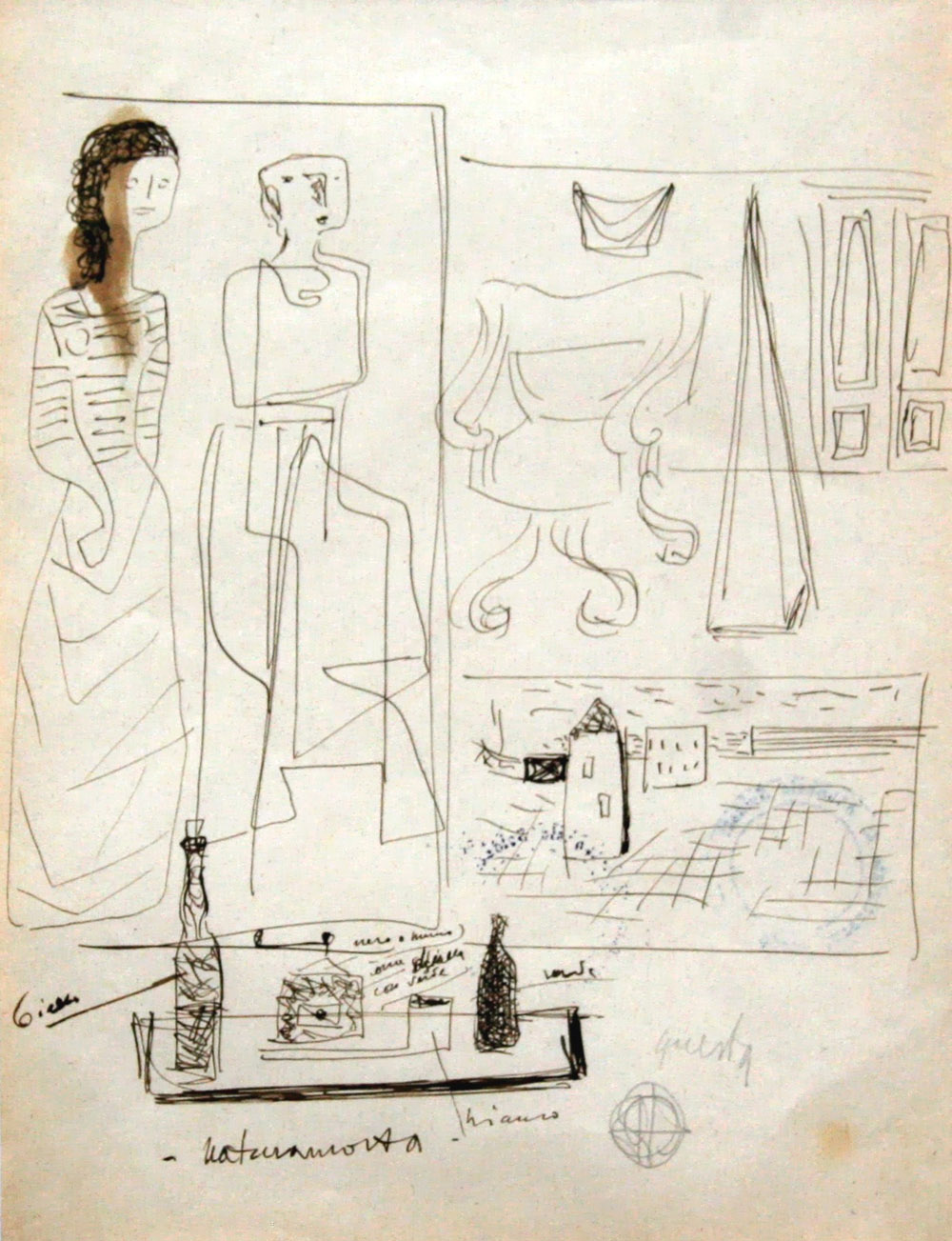 Atanasio Soldati 1896, Parma (Pr) - 1953, Parma (Pr) - [Italia] Costumi e natura morta china su carta 22x16,5 cm c. 1945 c.a. AS140149; opera con cornice certificato di autenticità Archivio Atanasio Soldati
