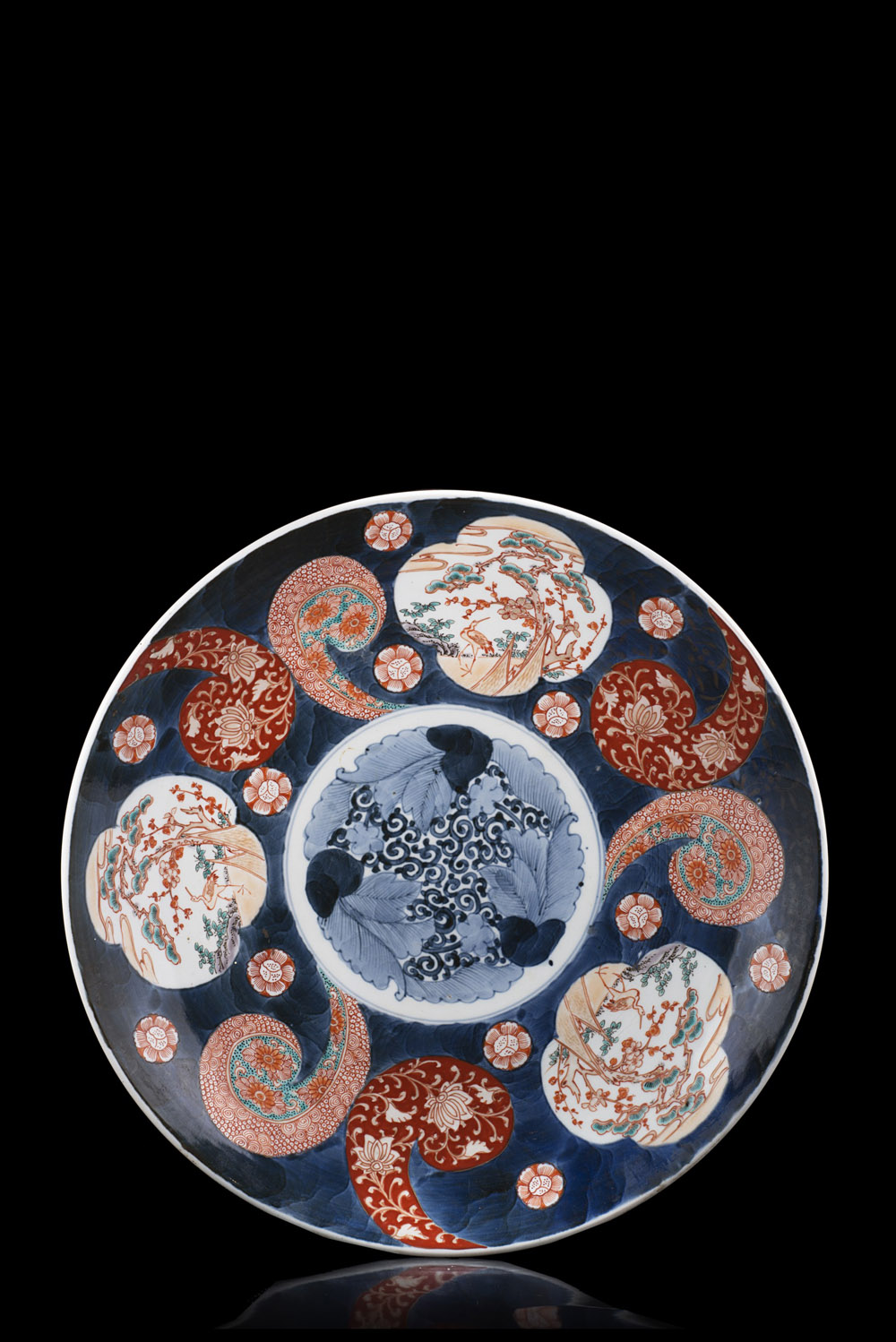 Grande piatto in porcellana in stile Imari, deocrato con motivi floreali e geometrici Giappone, XIX sec. A large Imari dish decorated with geometric and floral motifs Japan, 19th century (diam. 47 cm.)