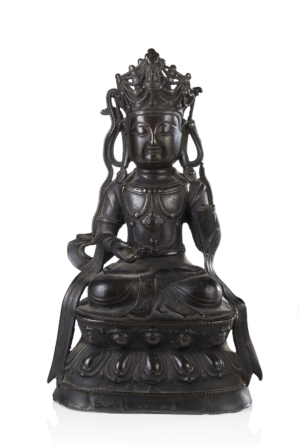 Bodhisattva in bronzo raffigurato seduto su base a doppio loto, indossa elaborata corona e gioielli (difetti e mancanze) Cina, dinastia Ming (1368-1644) A bronze model of a Bodhisattva seated on a double-lotus base, wearing an elaborate crown and beaded jewelry (losses and flaws) China, Ming dynasty (1368-1644) (h. cm. 23)