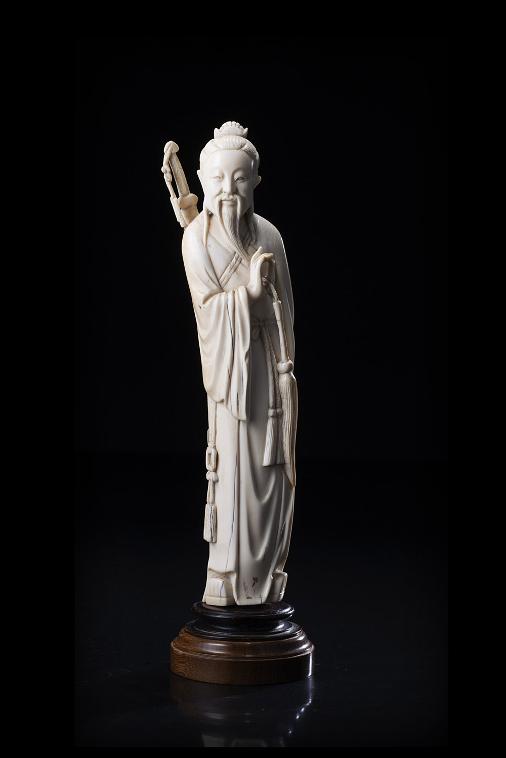 Immortale dalla lunga barba in avorio, indossa lunghe vesti, con una spada sulla schiena, con base in legno Cina, fine sec. XIX/inizio sec. XX An ivory carving of a bearded Immortal wearing long robes and carrying a sword on his back, with wood base (h. 23 cm.)