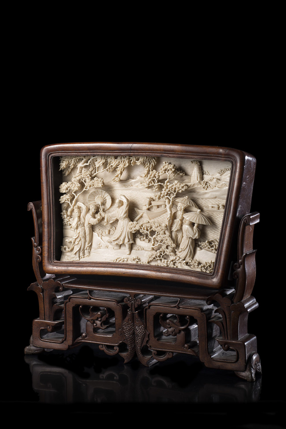 Placca di avorio intagliato raffigurante figure tra alberi sulla riva di un fiume, con cornice e supporto in legno intagliato Cina, inizio sec. XX An ivory rectangular plaque, carved with figures amongst a river shore, inset in a pierced and carved frame and stand China, early 20th century (l. max. 22.5 cm.)