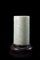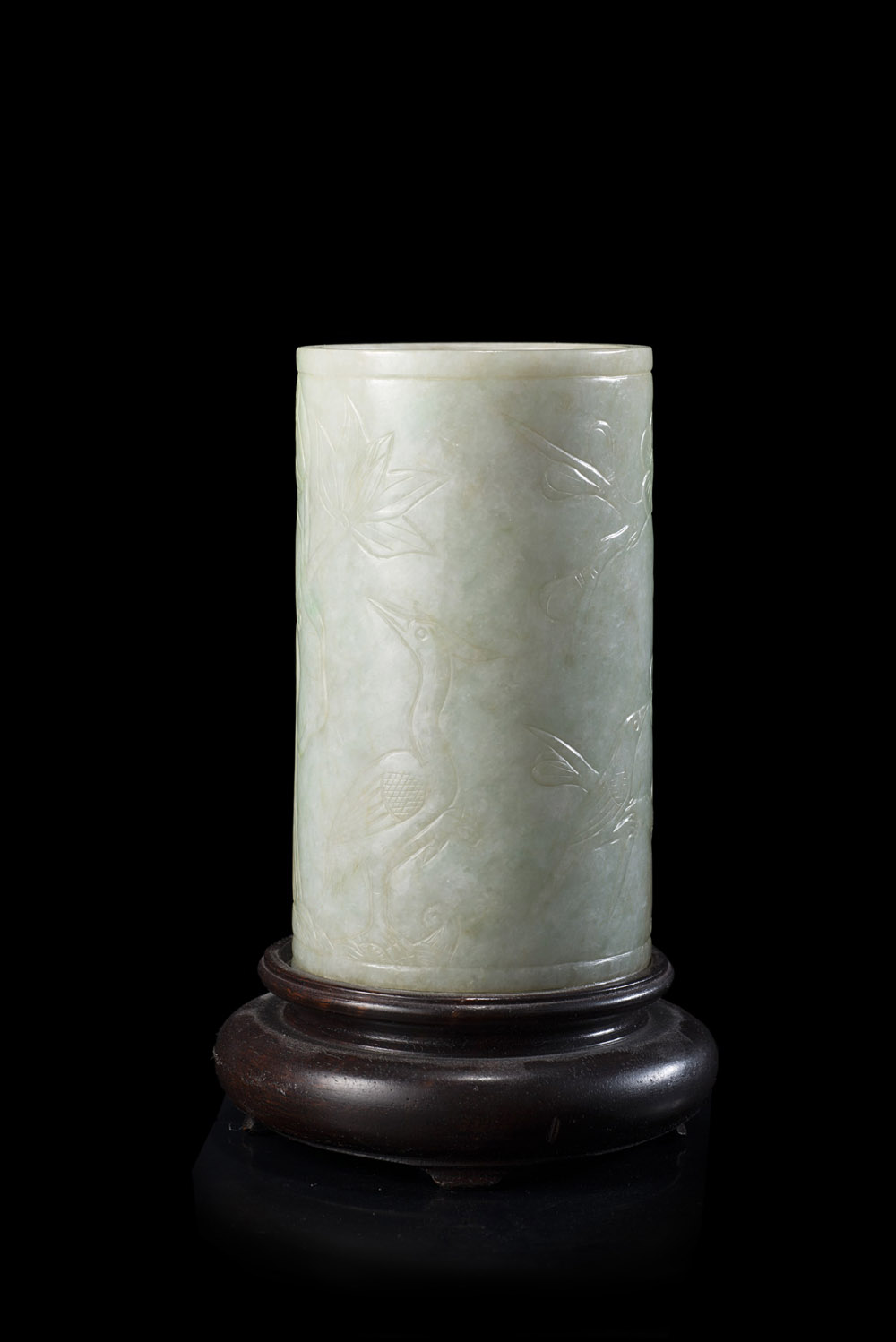 Portapennelli cilindrico in giadeite decorato con delicata incisione di una gru tra fiori di loto, base in legno Cina, inizio sec. XX A jadeite cylindrical brushpot, delicately incised with a crane amongst lotus flowers, with wood base (h. 11 cm., senza base)