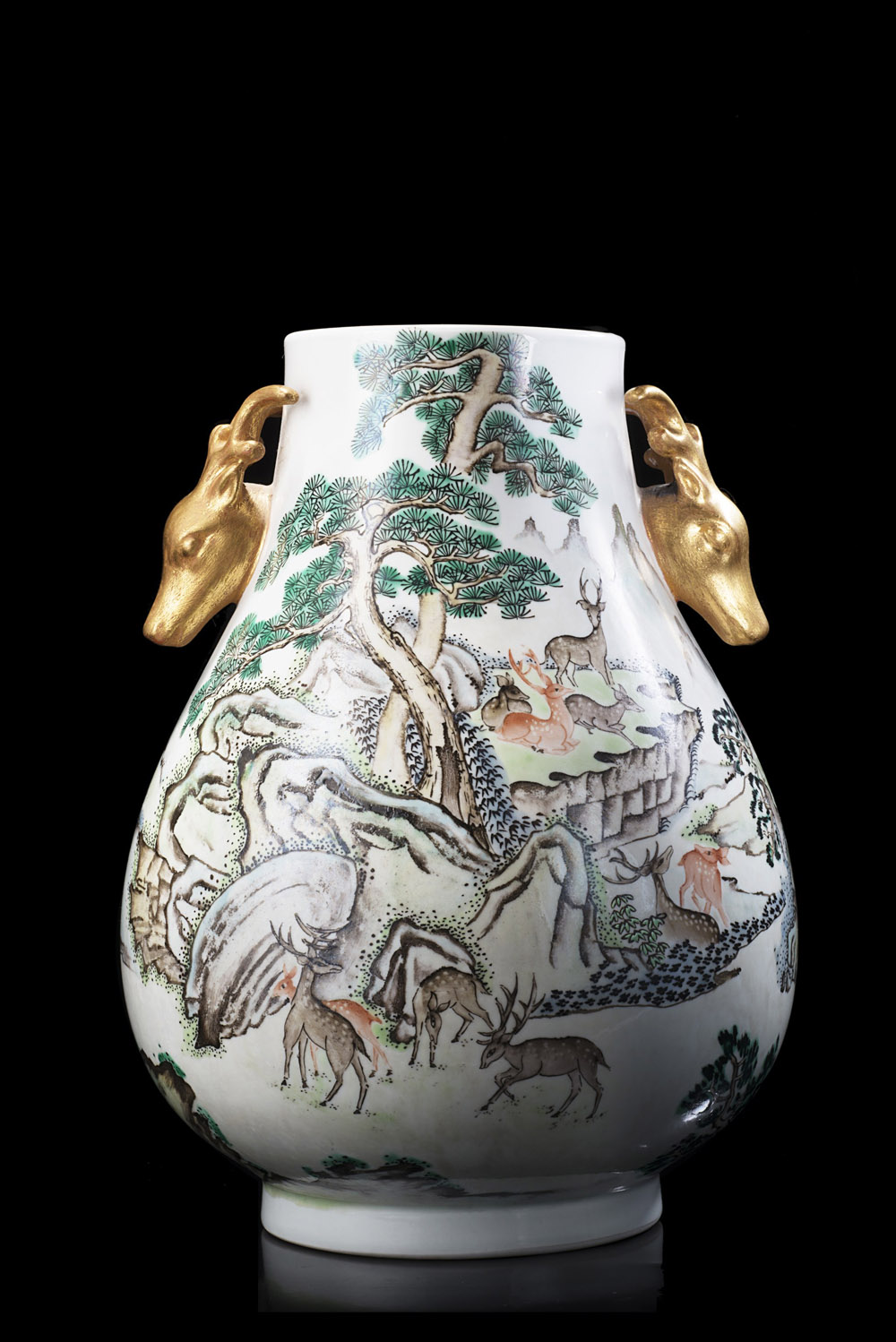 Vaso di forma arcaica hu con doppie anse dorate a forma di cervo, decorato in smalti policromi con il motivo dei "Cento cervi" in un paesaggio montuoso Cina, inizio sec. XX An archaistic hu-shaped vase with twin deer-head handles decorated with the "hundred deer" motif China, early 20th century (h. 29 cm.)