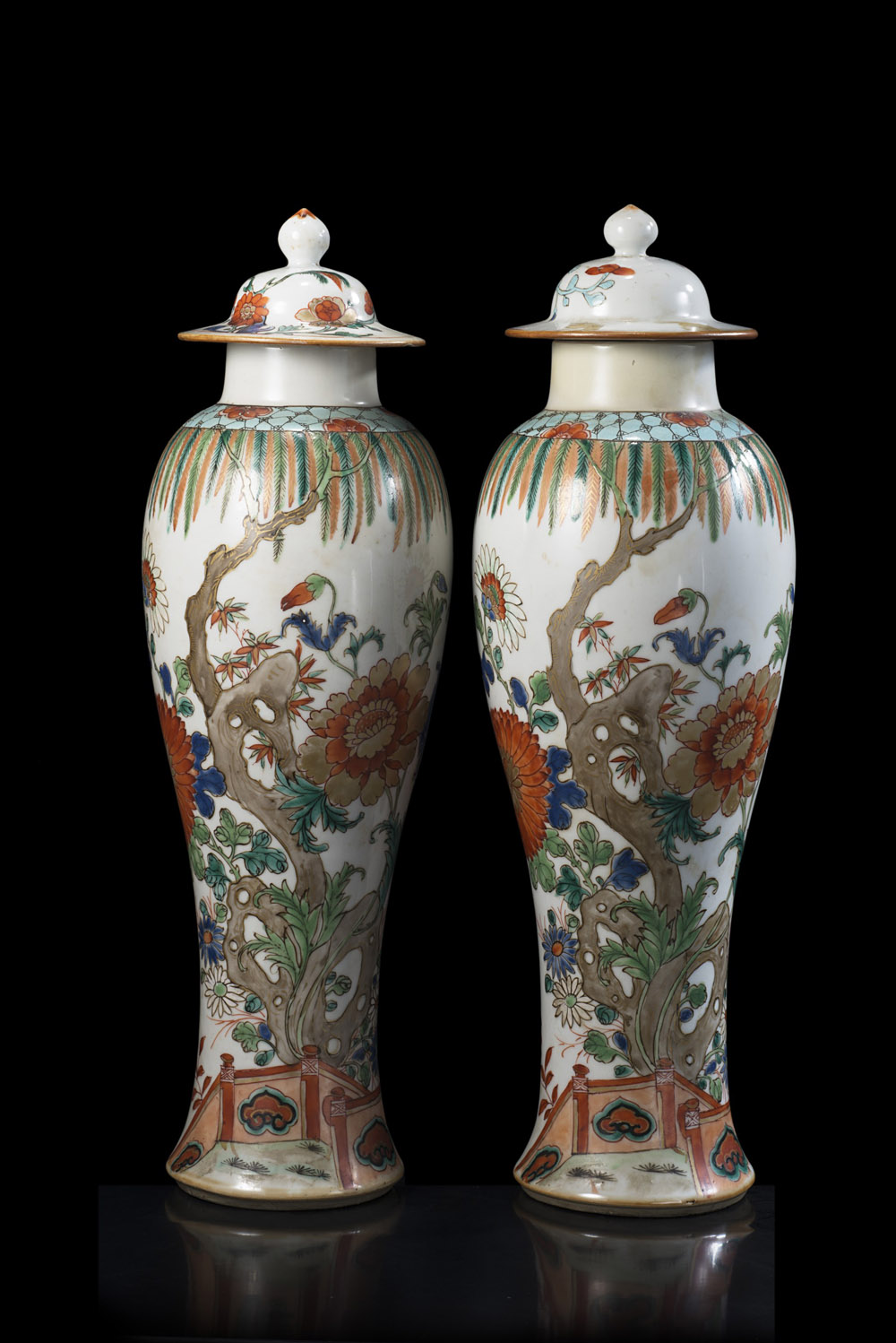 Coppia di piccoli vasi a balustro con coperchio con decorazione floreale in Famiglia Verde con lumeggiature dorate (difetti e restauri) Cina, sec. XVIII A pair of slender baluster vases and covers, eached enamelled and gilt with flowers issuing by rocks in fenced garden (losses and restoration) China, 18th century (h. 38 cm.)