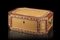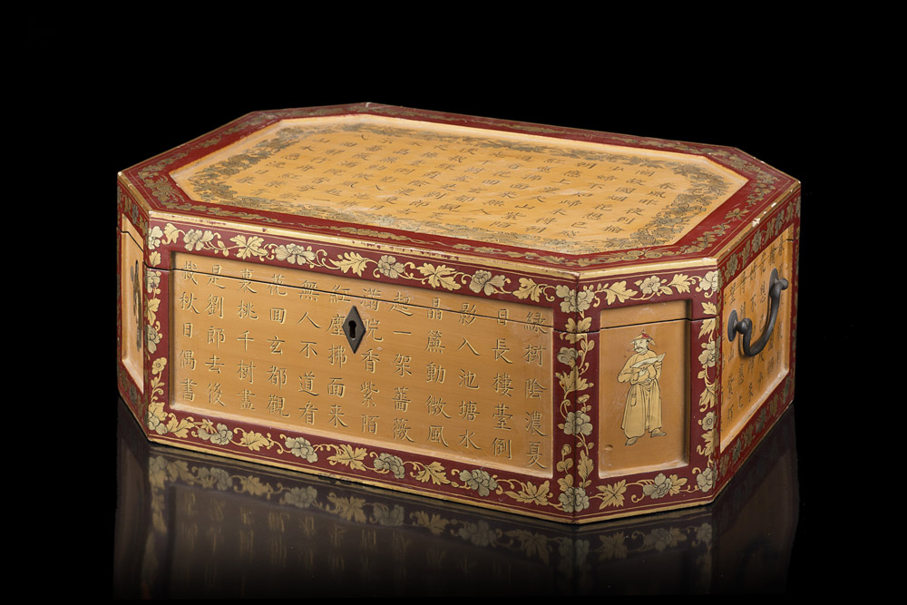 Scatola da cucito, l'esterno laccato in rosso e oro con figure, iscrizioni e...