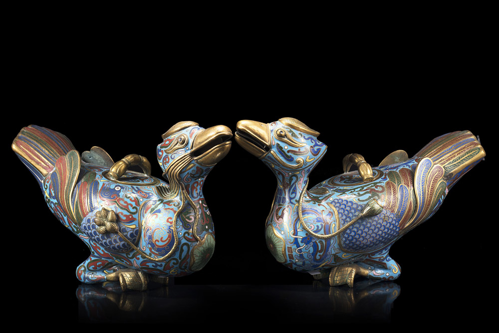 Coppia di brucia incenso a guisa di anatre mandarine in metallo cloisonnè, in posizione accovacciata, nel becco tengono foglie e fiori di loto, il corpo ed il piumaggio in smalti policromi su fondo turchese (lievi difetti) Cina, fine sec. XIX A pair of cloisonnè enamel 'mandarin ducks' censers, each modelled crouching, grasping a lotus stalk with the beak, the body and plumage in colourful enamels against a turquoise ground (minor flaws) China, late 19th century (l. max. 30 cm.)