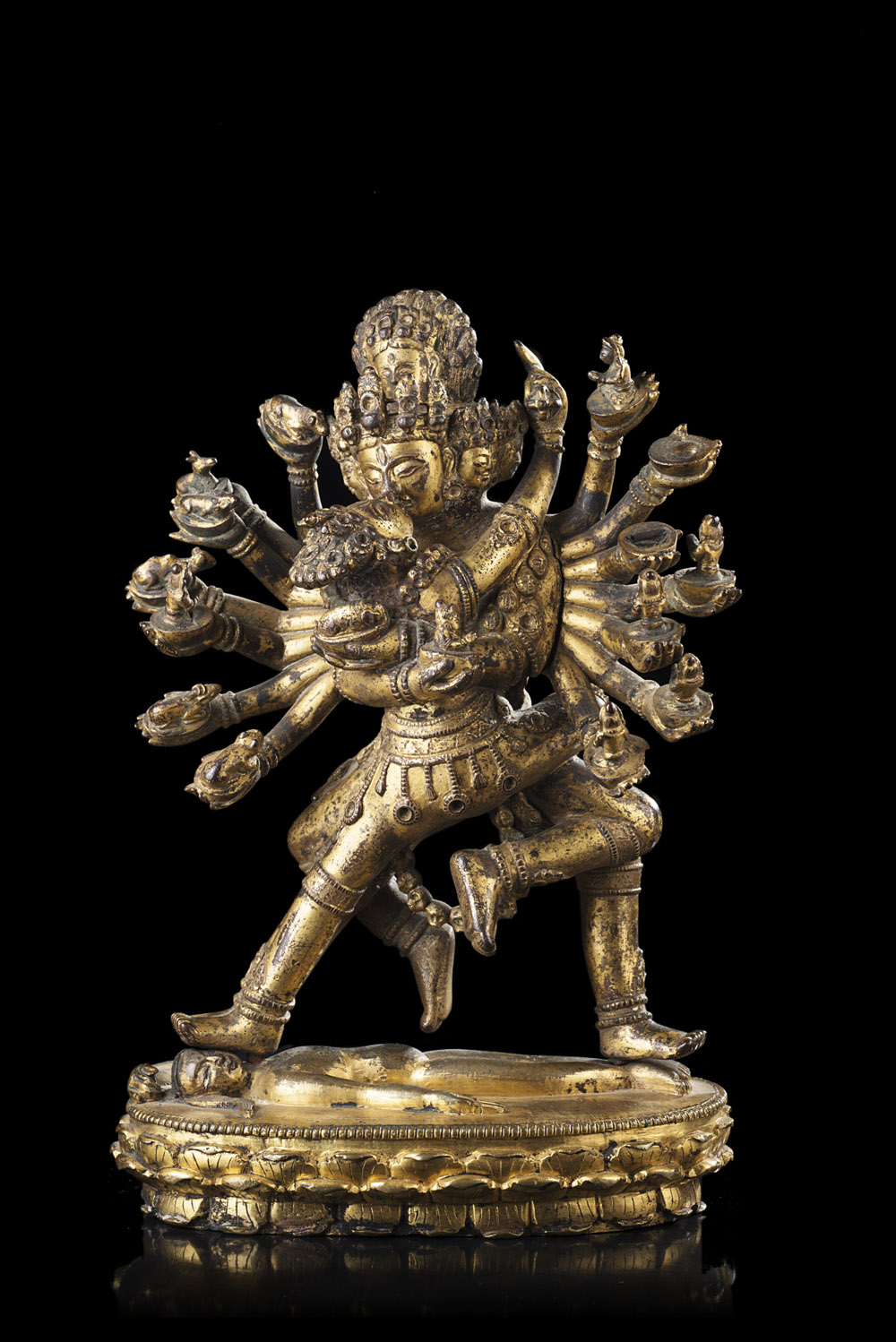 Scultura in bronzo dorato raffigurante Chakrasamvara and Vajrayogini, strette in un abbraccio, sovrastanti una figura sdraiata su base ovale a doppio loto Nepal, sec. XIX A bronze gilt model of Chakrasamvara and Vajrayogini, embraced over a a figure on an oval lotus base Nepal, 19th century (h. 18,5 cm.)
