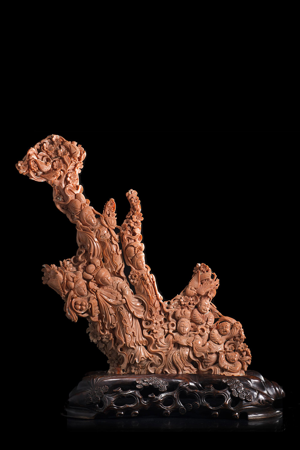 Grande ramo di corallo riccamente intagliato con figure femminili dalle lunghe vesti, ciascuna porta frutti o strumenti musicali, accompagnate da fanciulli e circondate da rami in fiore e uccelli, con base in legno intagliato Cina, inizio sec. XX Per questo lotto è disponibile l'Attestato di Libera Circolazione A large coral branch, richly carved and pierced with ladies wearing long robes and carrying fruits or musical instruments, accompanyied by boy attendants and surrounded by flowering branches and birds, with a carved wood base China, early 20th century Export license is available for this lot (h. 48 cm., weight 2846 gr.)