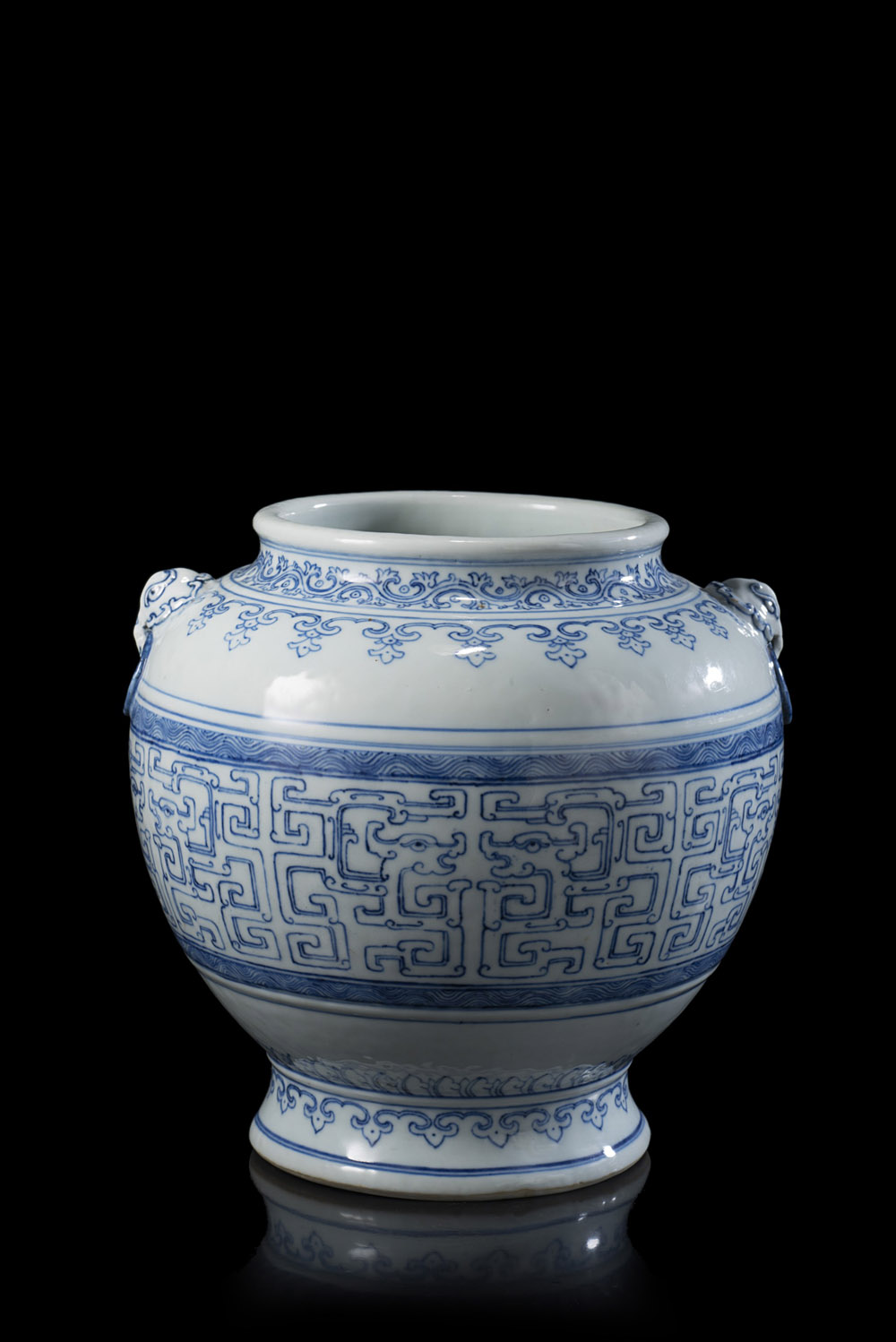 Vaso in porcellana bianca e blu, dalla forma bombata, con doppie anse a testa di elefante, decorato con motivi geometrici e draghi stilizzati (difetti) Cina, sec. XIX A blue and white vase, of globular form, with twin elephant-head handles, decorated with a band of geometric motifs and stylised dragons (flaws) China, 19th century (h. 21 cm.)
