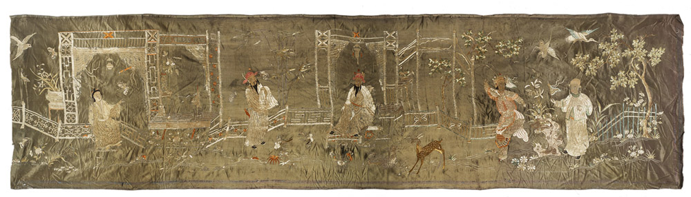 Ricamo in seta raffigurante figure e animali in paesaggio, su fondo verde, difetti e mancanze Cina, sec. XIX A rectangular silk embroidery depicting figures, animals in a landscape against a green ground China, 19th century (280x77 cm.)
