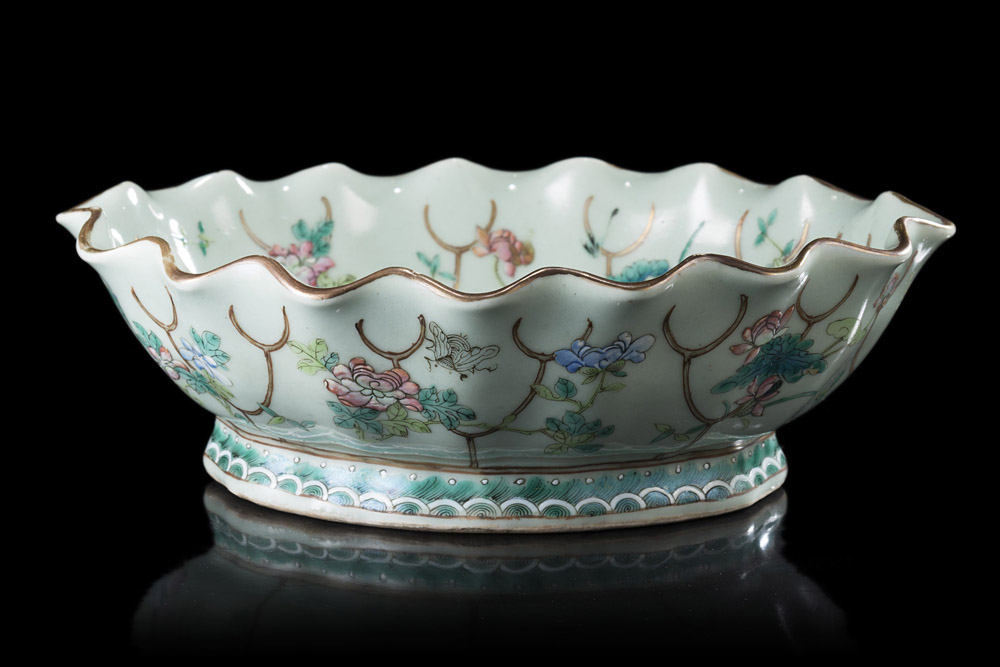 Ciotola a bordo polilobato decorata in Famiglia Rosa su fondo céladon a fiori e volatili Cina, sec. XIX A celadon-ground Famille Rose lobed bowl decorated with birds and flowers China, 19th century (lungh. 25,5cm.)