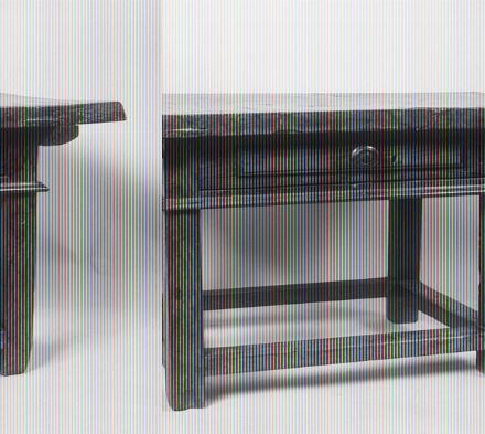 Tavolino a bischetto in noce con cassetto, gambe squadrate riunite da...