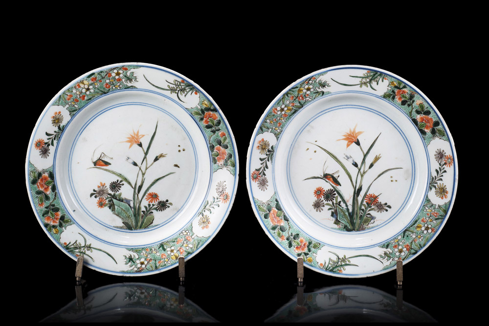 Coppia di piatti in porcellana Famiglia verde, con delicata decorazione centrale di fiore con insetto, il cavetto con decorazione floreale Cina, seconda metà sec. XVIII A pair of Famille Verte dishes, each with a delicate central flower with a grasshopper, the cavetto with floral decoration China, second half of 18th century (diam. 21,5 cm.)
