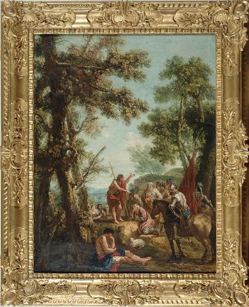 Attr. a Gaspare Diziani LA PREDICA DEL BATTISTA Olio su tela, cm. 68,2x52 cornice in legno intagliato e dorato. Provenienza: Frascione, Firenze; Collezione privata, Firenze