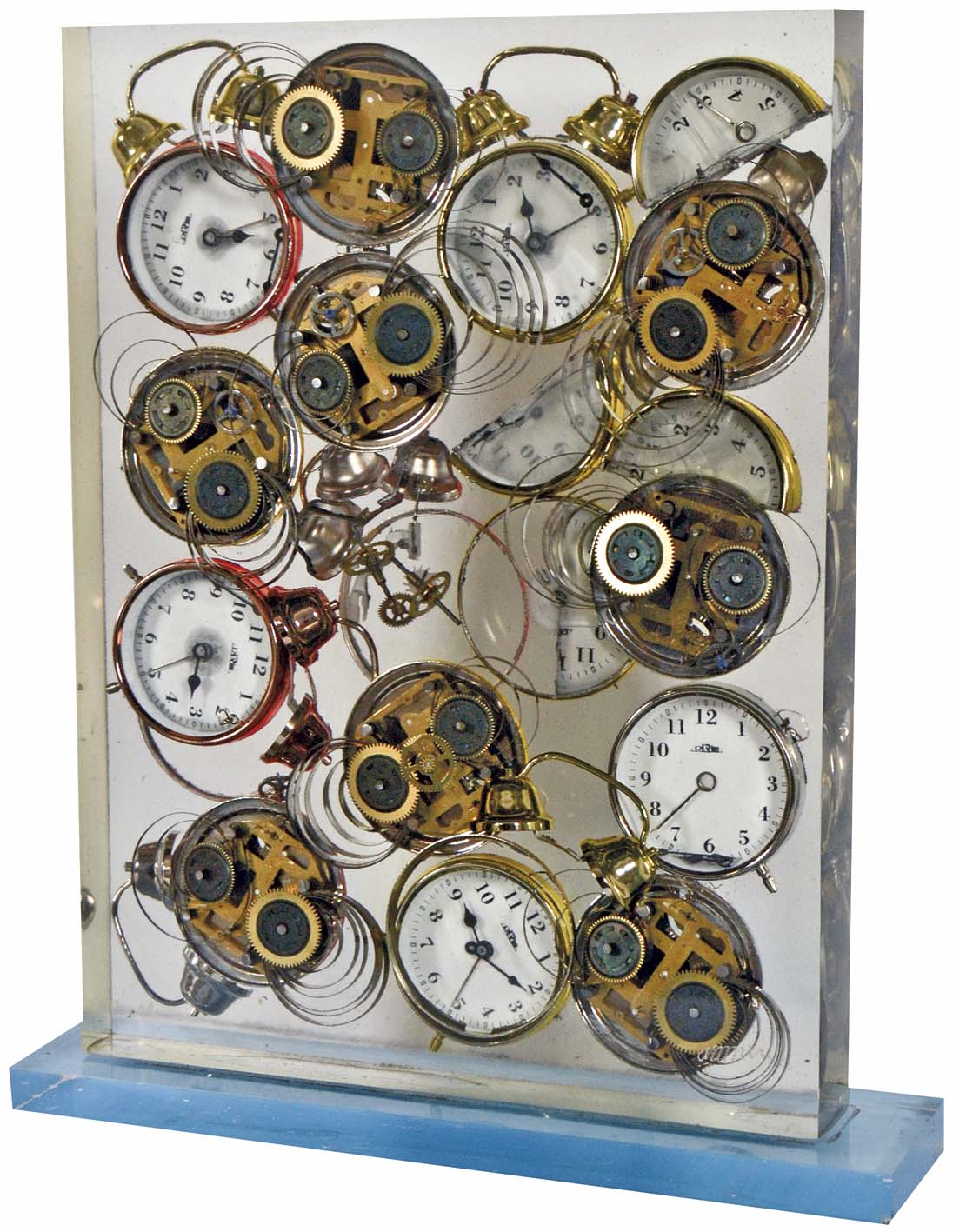 ARMAN FERNANDEZ Nizza 1921 - 2005 Sveglie 2000 accumulazione di sveglie in resina ipossidica es. 90/100 41,5x29,5x4,5 firma in basso a destra tiratura in basso a sinistra opera registrata presso l'Archivio Denyse Durand Ruel nr. 6796 Bugno Art Gallery Venezia - certificato su foto