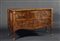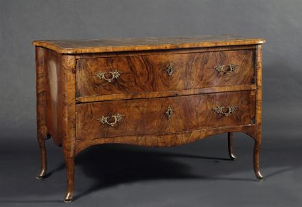 Cassettoncino a balestra in noce e radica di noce, fronte e fianchi mossi piano sagomato con cornicette intarsiate a motivi geometrici, angoli stondati, due cassetti sul fronte, gonna sagomata, gambe arcuate Italia centrale XVIII sec., cm. 82x118x58