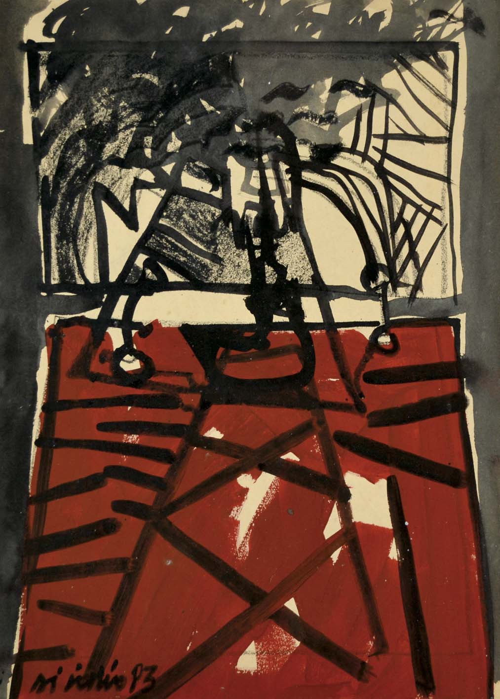 DI IORIO MARIO Tarvisio 1958 - 1999 La scala della follia 1983 tecnica mista su carta 47x33,5 firma e data in basso a sinistra