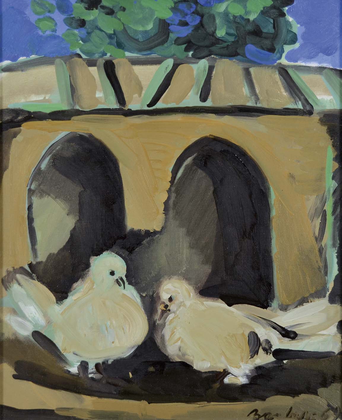 BARBARO SAVERIO Venezia 1924 Due colombe nella piccionaia 1969 olio su tela 60x50 firma e data in basso a destra, firma data e titolo al retro autentica dell'Autore su foto