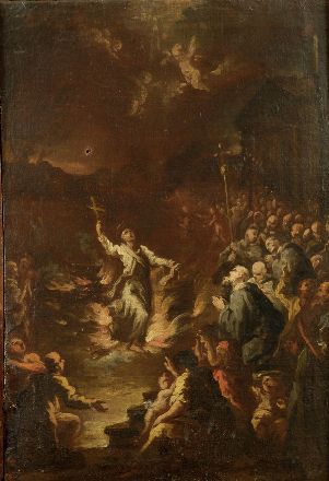 Ignazio Hugford (Pisa, 1703 - Firenze, 1778) IL MIRACOLO DEL FUOCO DI SAN PIETRO IGNEO Olio su tela, cm. 49x33,5 antica cornice in legno dorata.