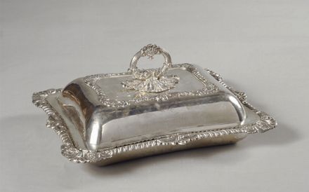Legumiera rettangolare in argento bordi sbalzati coperchio con stemma e presa sagomata, Sheffield, XIX sec. gr. 2150