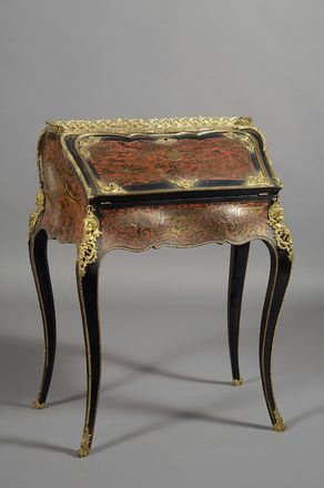 Piccola scrivania boulle, completamente decorata da intarsi in metallo inciso, piano ribaltabile sagomato, scarabattolo interno con cassettini e ripiani, gambe mosse, Francia, Napoleone III, cm. 87x59,5x41