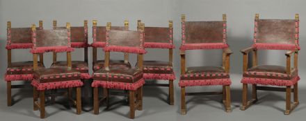 Sei sedie e due poltrone in noce, con schienali e sedute in cuoio. Toscana...