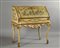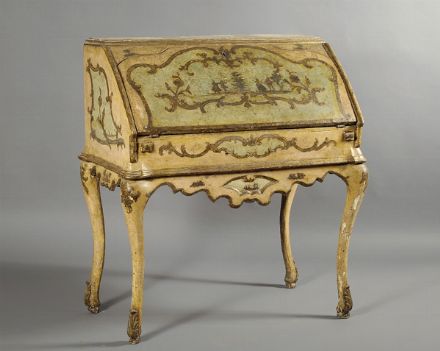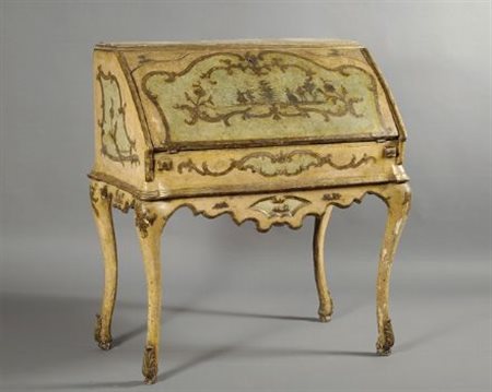 Scrivania in legno laccato con decori all’arte povera sul fronte e sui fianchi, piano sagomato a ribalta, scarabattolo interno con ripiani e due cassetti, alte gambe mosse, Italia meridionale, XVIII sec., cm. 110x97x56