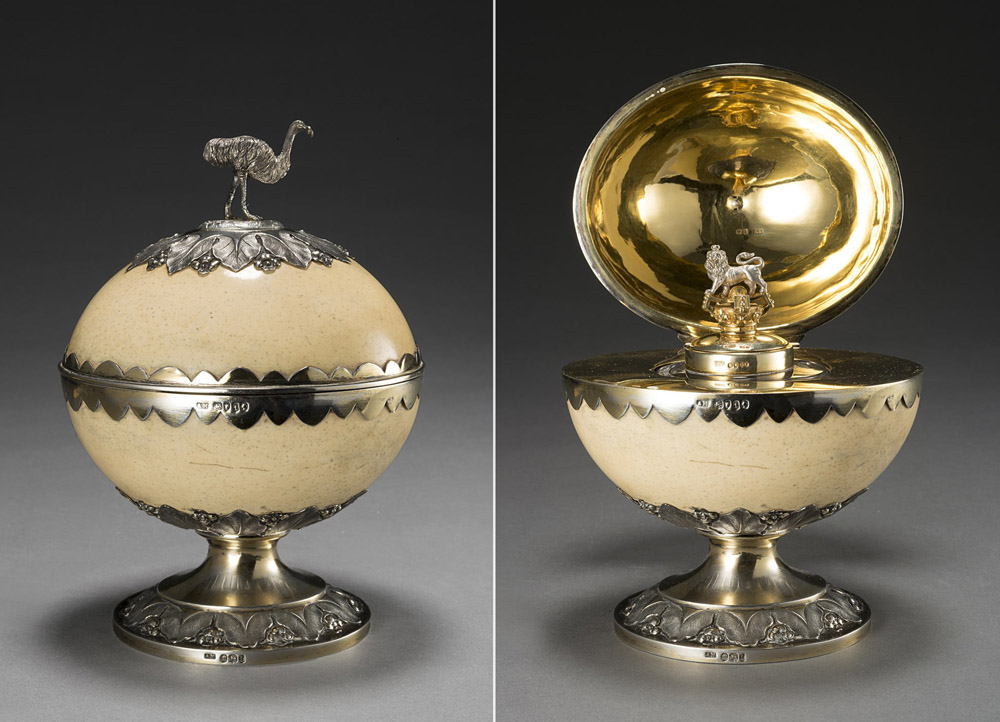 Calamaio ricavato da uovo di struzzo montato in argento con ghiere cesellate e sbalzate a foglie e fiori. Presa a figura di struzzo a tuttotondo che sorregge ferro di cavallo. Interno in vermeille con portainchiostro in vetro e argento dorato e cesellato con leone su corona. Argentiere Alexander Macrae, Londra 1866. (lievi difetti) (h. cm 23) Inkwell obtained from an ostrich egg mounted on silver. London, 1866 (minor defects)