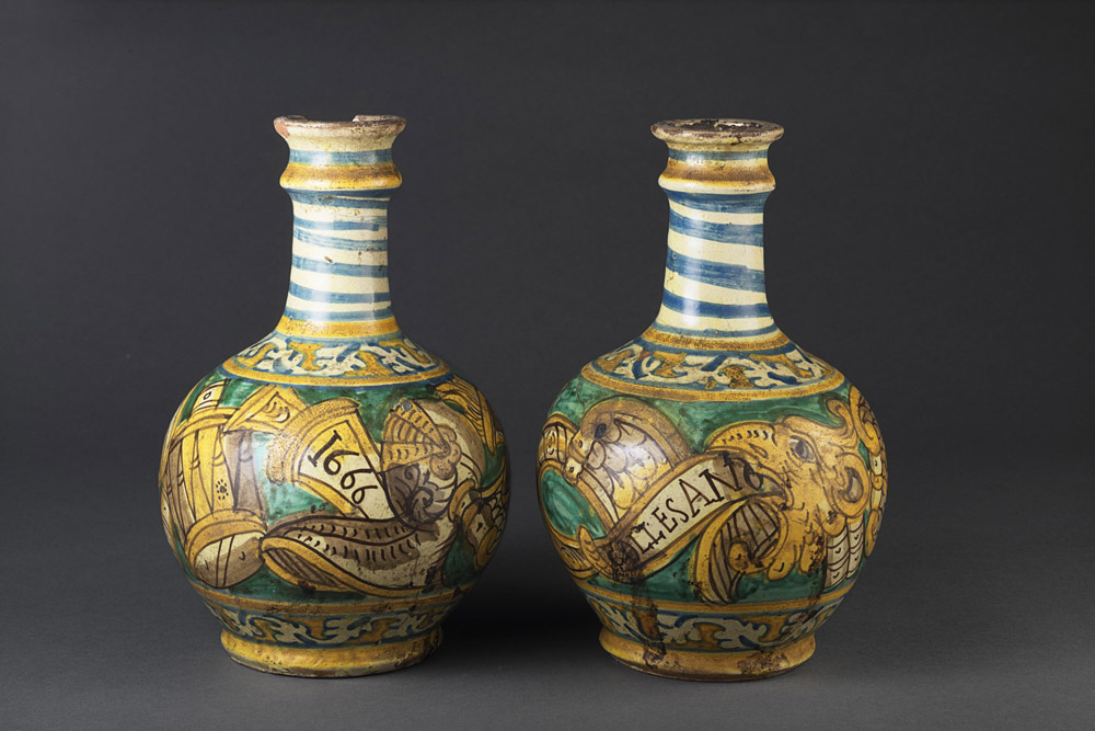 Coppia di bottiglie in maiolica policroma. La parte centrale si presenta di corpo globulare con collo stretto e lungo con bulbo e bordo estroflesso. La decorazione centrale è a trofei racchiusi da due ghirlande vegetali mentre il collo è decorato a grosse righe azzurro/blu su smalto bianco. All’interno dei trofei vi è la data 1666 e la scritta COLLESANO in bruno. Sicilia, Collesano, 1666 (h. cm 23,5 e 24) (rotture e difetti) Pair of multi-coloured majolica bottles. Sicily, Collesano, 1666 (defects and broken parts)