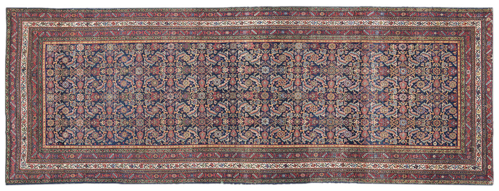 Tappeto persiano, inizio sec. XX. Campo blu decorato a motivi floreali stilizzati nei toni del rosso, avorio, verde e giallo (cm 500x198) Early 20th-century Persian carpet