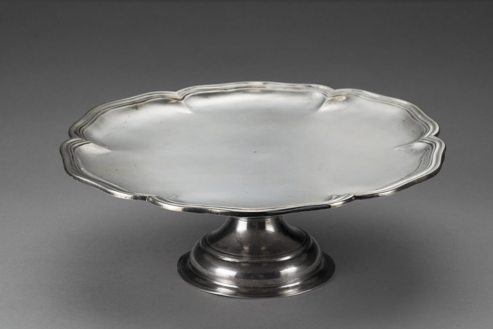 Alzata in argento con piede circolare gradinato e modanato, nodo a rocchetto e piatto liscio a bordo mistilineo. Marchio della Torretta e prove di saggio: Genova 1778 (h. cm 10x d cm 26) (gr 730 ca) (graffi e ammaccature) Silver epergne. Genoa, 1778 (scratches and dents)