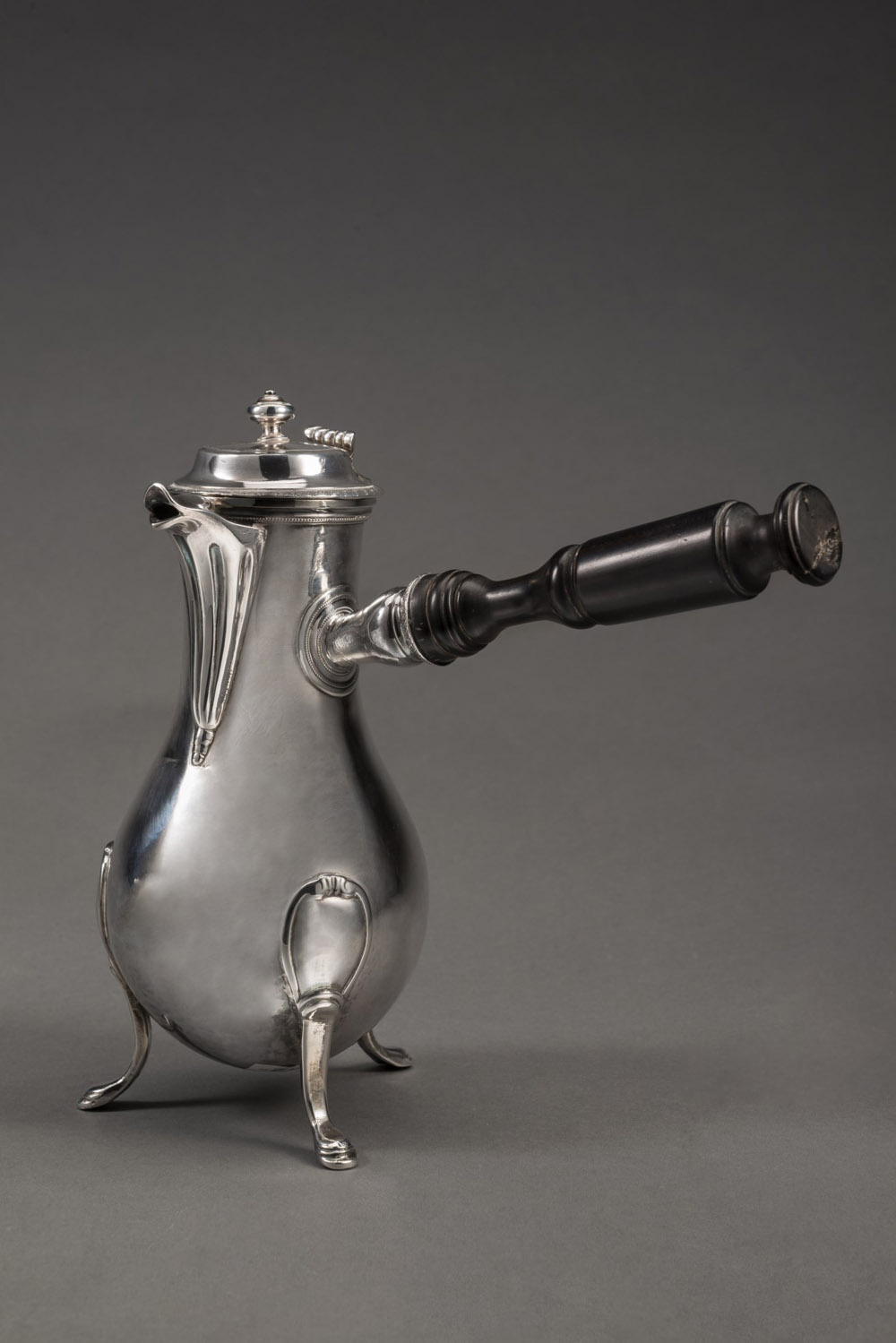 Cioccolatiera in argento a corpo liscio con beccuccio stilizzato e manico in legno ebanizzato. Argentiere Cavet Nicholas Crysostone, Parigi 1798/1809 (h. cm 20) (gr lordi 430) (difetti) Silver chocolate pot. Paris, 1898/1809 (defects)
