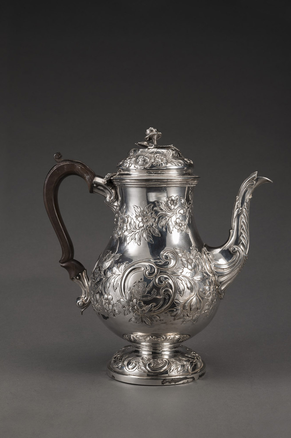 Caffettiera in argento con corpo sbalzato ed inciso a fiori e foglie, presa...