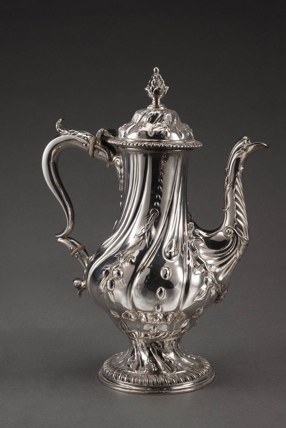 Caffettiera in argento con corpo costolato sbalzato con bacche, presa del coperchio a pinnacolo tornito, ansa sagomata in argento. Londra, 1763. Argentiere Wlliam & Robert Teaston (gr lordi 970) (lievi difetti) Silver coffee pot with ribbed body. London, 1763 (minor defects)