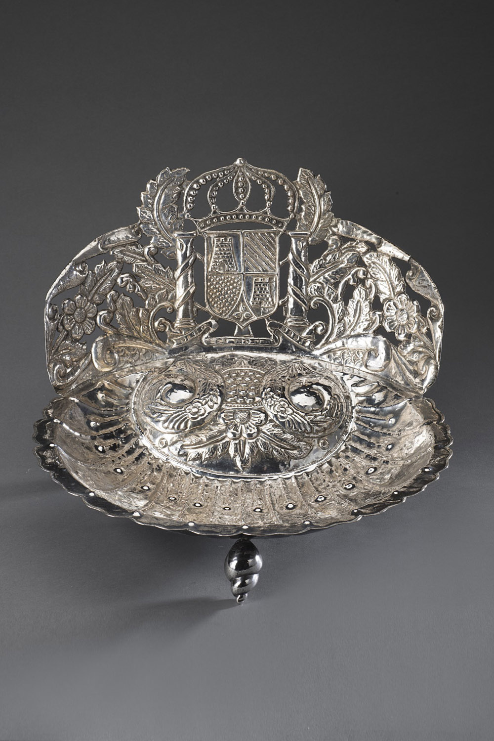 Acquasantiera in argento, vasca di forma ovale sorretta da tre piedi a forma di conchiglia, sponda traforata e decorata a motivi vegetali e stemma centrale coronato con motto "Dieu et mon droit" Spagna, sec. XVIII (cm 37,5x37x27) (gr 1400 ca) (difetti) 18th-century Spanish silver stoup (defects)