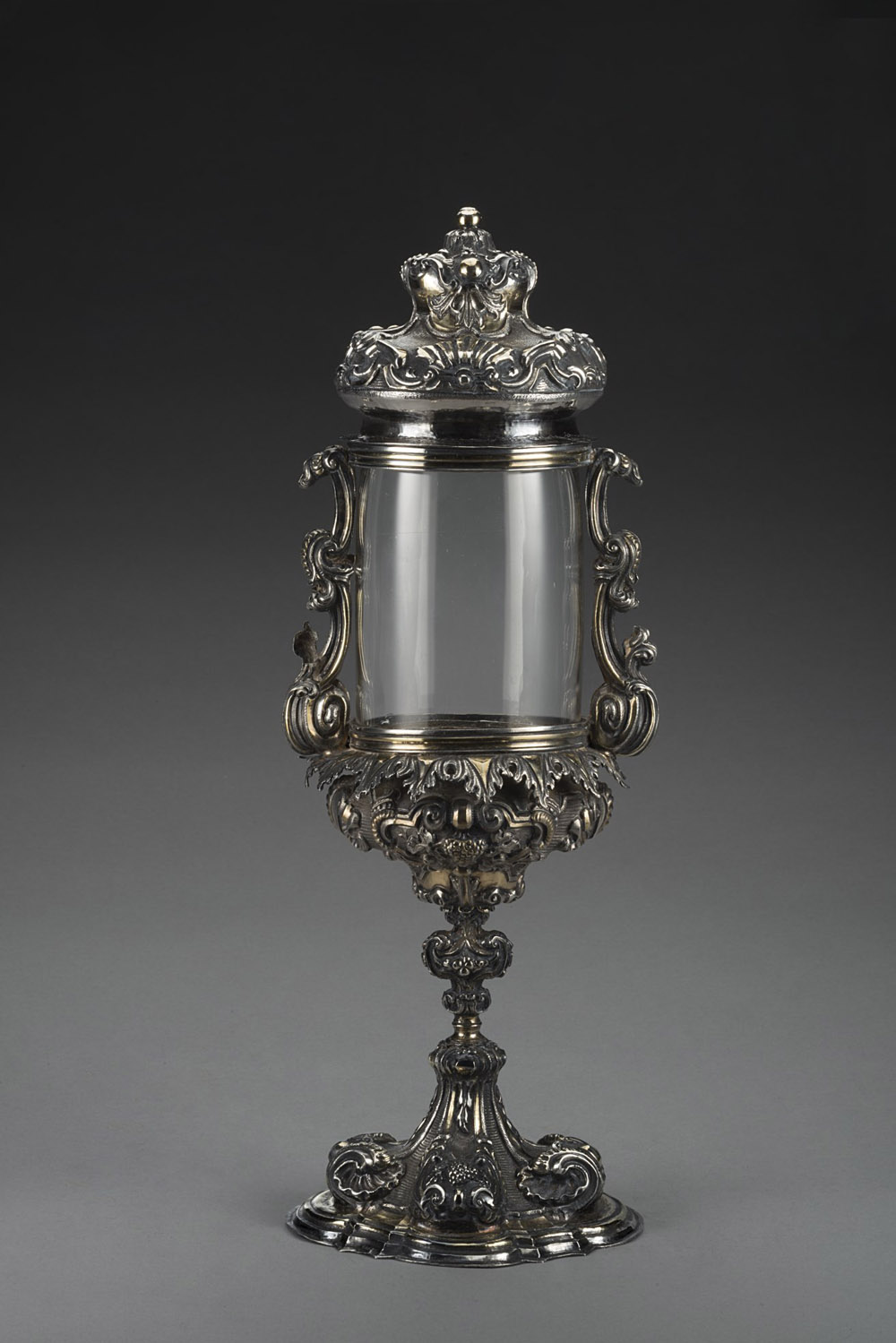 Ostensorio detto ambrosiano in argento parzialmente dorato poggiante su base mistilinea gradinata quadripartita a volute sbalzate. Corpo cilindrico sorretto da una struttura a due montanti contenente teca in vetro. Coperchio a doppia modanatura. Decori a volute, conchiglie e motivi fitomorfi. Bottega lombarda del sec. XVIII, all'insegna dei due ferri di cavallo: probabilmente Maina Crespi (h. cm 36,5x largh. cm 13) (difetti e mancanze) 18th-century silver monstrance with decorations (defects and minor losses)