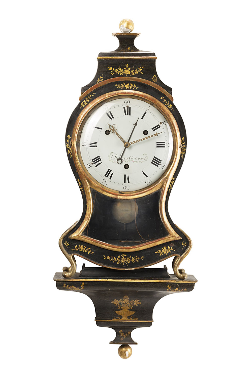 ROBERT COURVOISIER Pendola Neuchâteloise in lacca nera con decorazioni in oro...