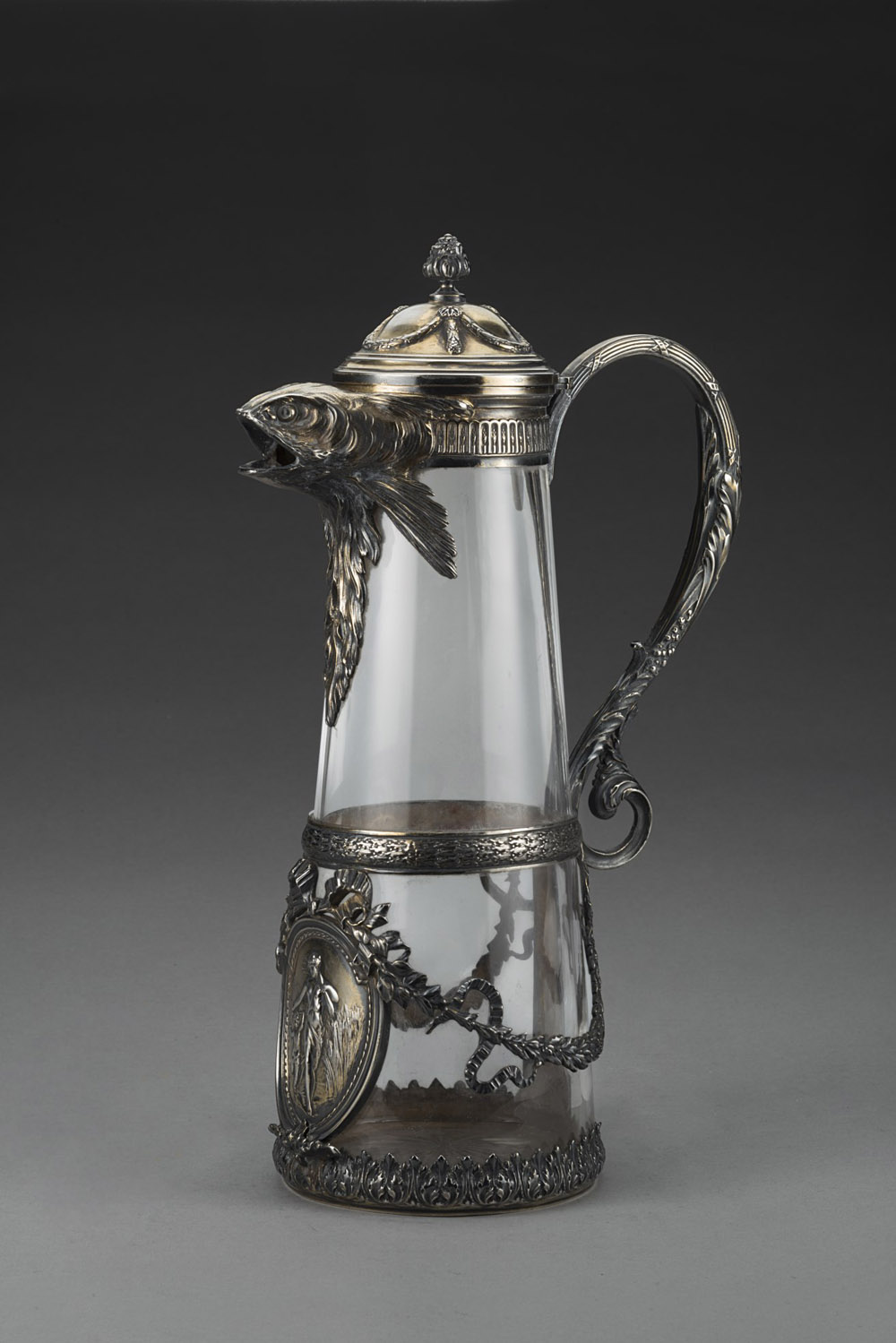 Versatoio in vetro con montatura in argento decorato con bassorilievo firmato G.P. Legastelois. Beccuccio a forma di testa di pesce, festoni, ghirlande e nastri fitomorfi. Francia, seconda metà del sec. XIX (h. cm 30) Glass and silver jug. France, second half of the 19th century