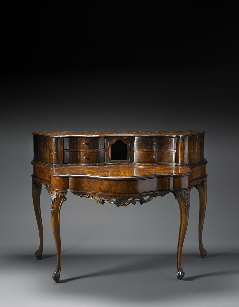 Scrivania di forma mossa in noce e radica, piano con alzata a quattro cassetti e vano centrale. Fascia ad un cassetto, gambe mosse intagliate a volute all'attacco e terminanti con piedi a ricciolo. Ferrara, sec. XVIII (cm 137x104x60) (restauri) Walnut and briar root desk. Ferrara, 18th century (restorations)