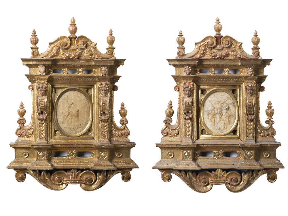 Coppia di cornici in legno intagliato, dorato e laccato con cimase a volute e pinnacoli. Facce traforate con montanti scolpiti a teste di putti in policromia. Contenente medaglioni in cera raffiguranti scene religiose. Sec. XVIII (cm 58x42) (difetti e mancanze) Pair of 18th-century carved and lacquered gilt-wood frames (defects and restorations)