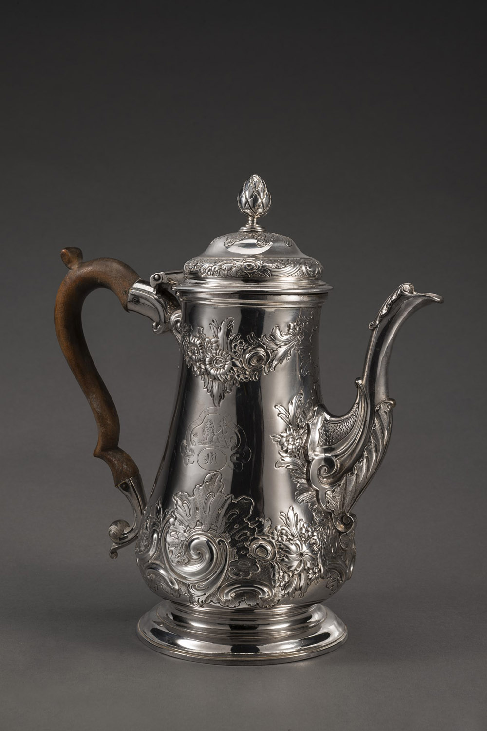 Caffettiera in argento a corpo sbalzato a fiori e volute fogliate inciso a stemma nobiliare, leone e cifre, presa del coperchio a pigna tornita, ansa in legno. Argentiere Mackhoul (?) Londra 1754 (h. cm 25) (gr lordi 990) (difetti e restauri) Provenienza Faraone. Etichetta alla base Silver coffee pot. London, 1754 (defects and restorations) Origin: Faraone. Label on base