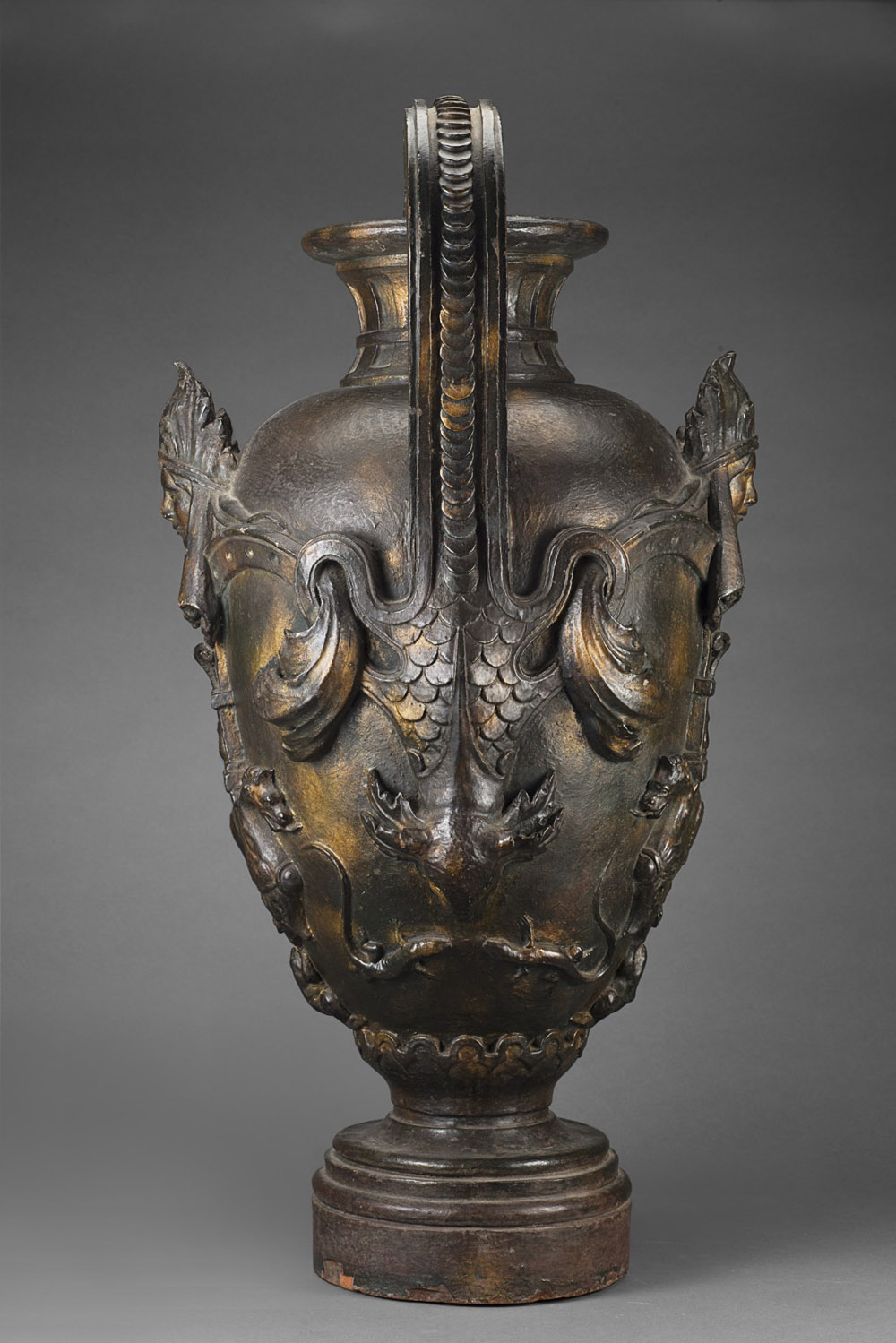 Antico vaso biansato in terracotta dipinto. Anse mosse terminanti con teste di animali fantastici, corpo di forma ovoidale con teste femminili fra girali di foglie sopra profilo tra mostri marini, su base circolare (h. cm 70) (difetti e mancanze) Ancient painted terracotta vase (defects and minor losses)
