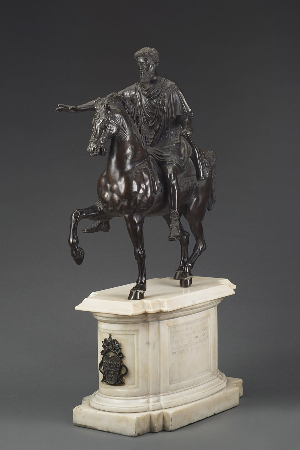 Artista romano del sec. XIX "Statua equestre di Marco Aurelio" riproduzione in bronzo della scultura del Campidoglio (h. cm 40) Poggiante su base a plinto di forma sagomata in marmo bianco con iscrizioni in latino e stemmi nobiliari in bronzo (lievi difetti) 19th-century Roman artist "Equestrian statue of Marcus Aurelius" (minor defects)