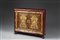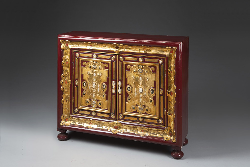 Mobiletto eclettico laccato a due ante con fronte a fregi di legno intagliato e dorato, decorato da cammei e micromosaici antichi e del sec XIX raffiguranti profili virili, vedute romane e intarsi in pietre dure (cm 113x95x38) (difetti e mancanze) Two-door lacquered cabinet with ancient and 19th-century mosaics (defects and minor losses)