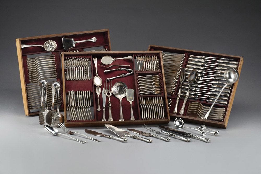 Servizio di posate in argento per dodici persone composto da: ventiquattro forchette, ventiquattro coltelli e dodici cucchiai da tavola, dodici forchette, dodici cucchiai e dodici coltelli da frutta, dodici forchette e dodici coltelli da pesce, dodici cucchiai da dolce, ventiquattro cucchiaini da tè e caffè e venticinque posate da portata. In custodia (gr 10000 ca. escluse parti non in argento) (difetti) Silver flatware for twelve (defects)