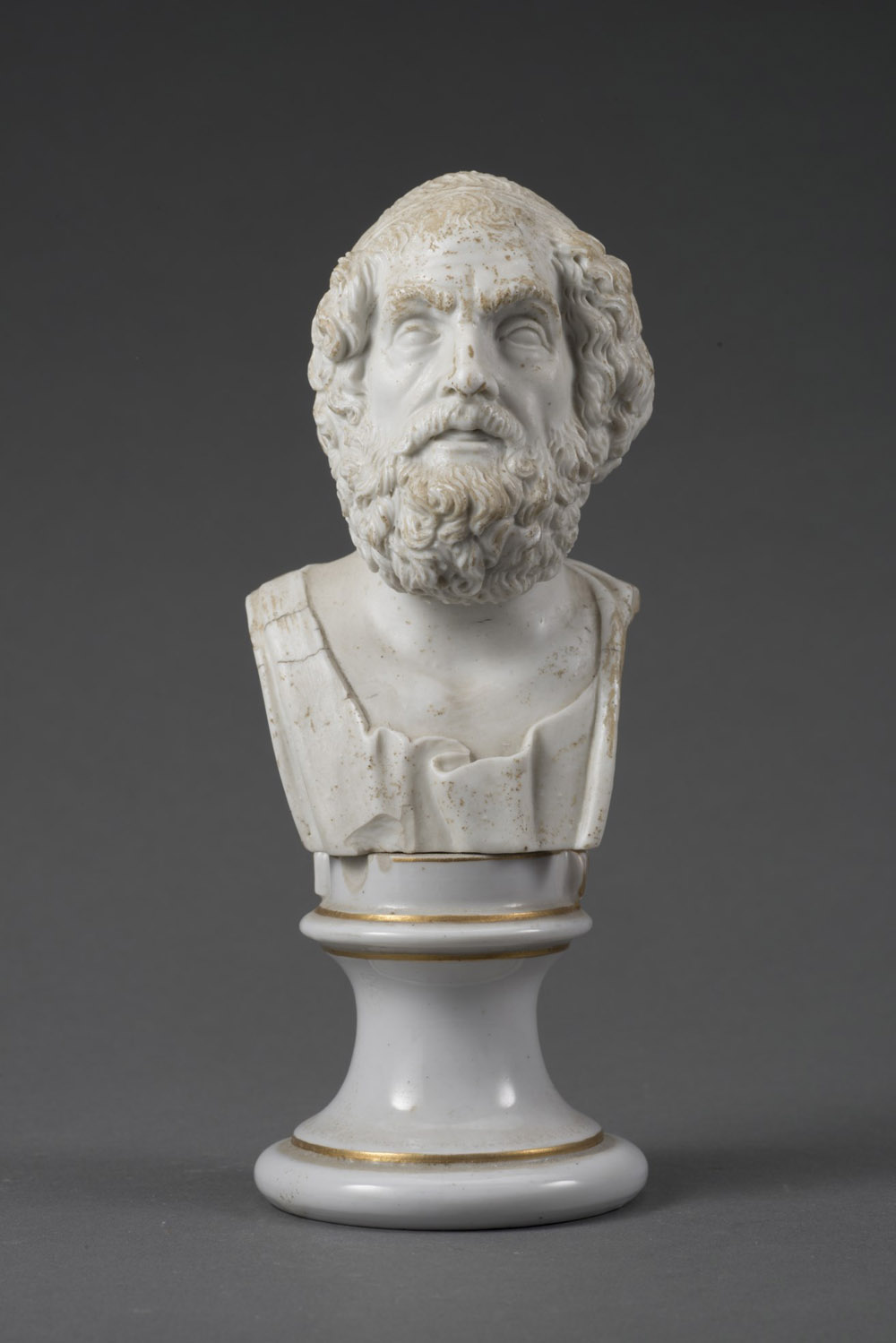 Busto in "biscuit" raffigurante Omero su base a plinto in porcellana verniciata e filettata in oro, modellatore Filippo Tagliolini, Real Fabbrica Ferdinandea 1790-1800. Marca dell'ancora in rosso ferro alla base (h. cm 18) (difetti, su base di epoca posteriore) Modello dal marmo greco della collezione Farnese. Biscuit bust, Real Fabbrica Ferdinandea, Naples, 1790-1800 (defects, porcelain base of a later period)
