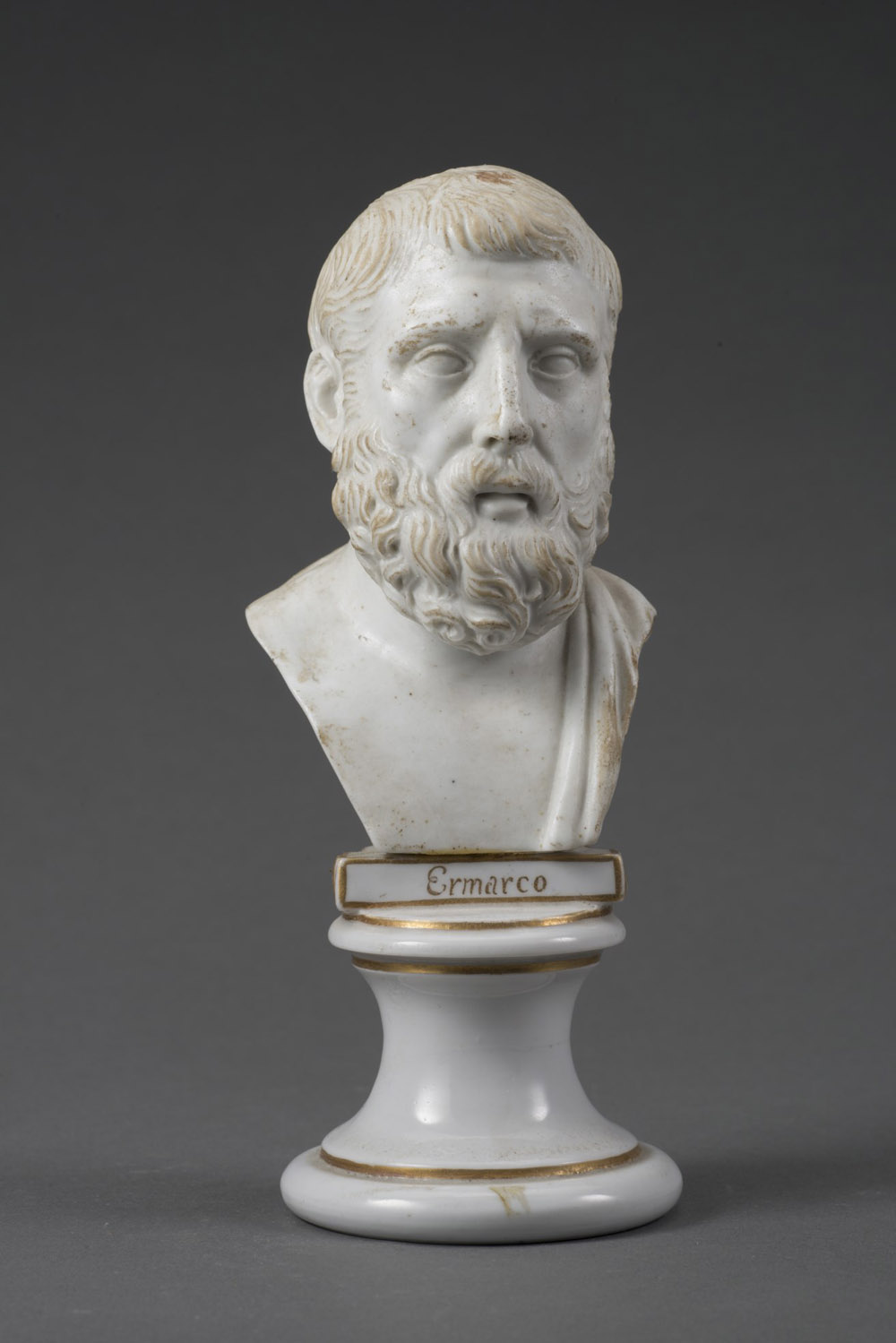 Busto in "biscuit" raffigurante Ermarco, su base a plinto in porcellana...