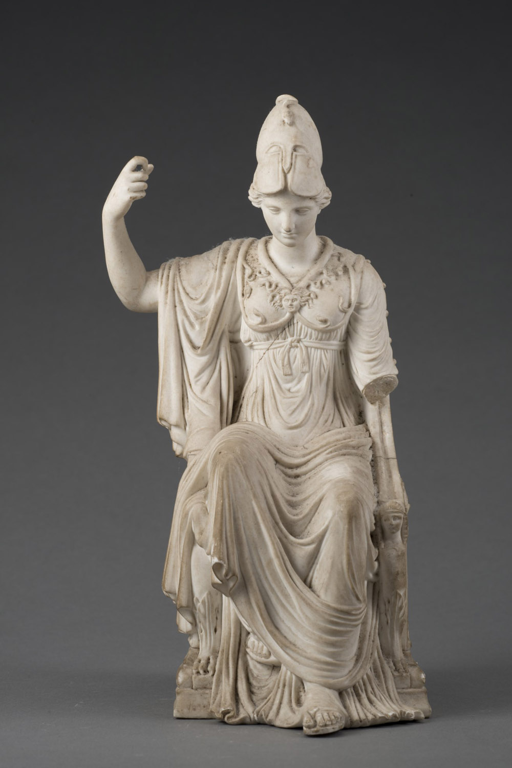 Figura di Minerva in "biscuit" Filippo Tagliolini (1745-1809), Real Fabbrica Ferdinandea, Napoli, fine sec. XVIII- inizio sec. XIX. Raffigurata seduta su poltrona decorata da festoni e figure di erme (h. cm 25) (difetti e mancanze) Biscuit Minerva figura, Real Fabbrica Ferdinandea, Naples, late 18th century-early 19th century (defects and losses)