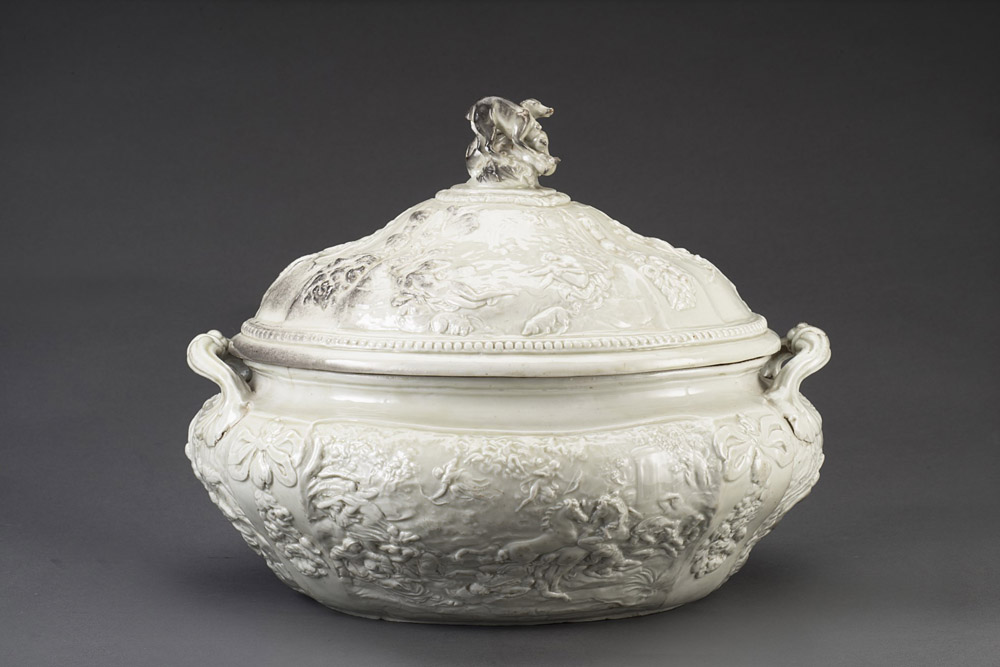 Rara zuppiera in porcellana. Con coperchio, presa a tutto tondo. Doccia, 1745-1750 (l. cm 31,5) (difetti di cottura, lievissime mancanze) Porcelain tureen (baking defects, very small missing parts)